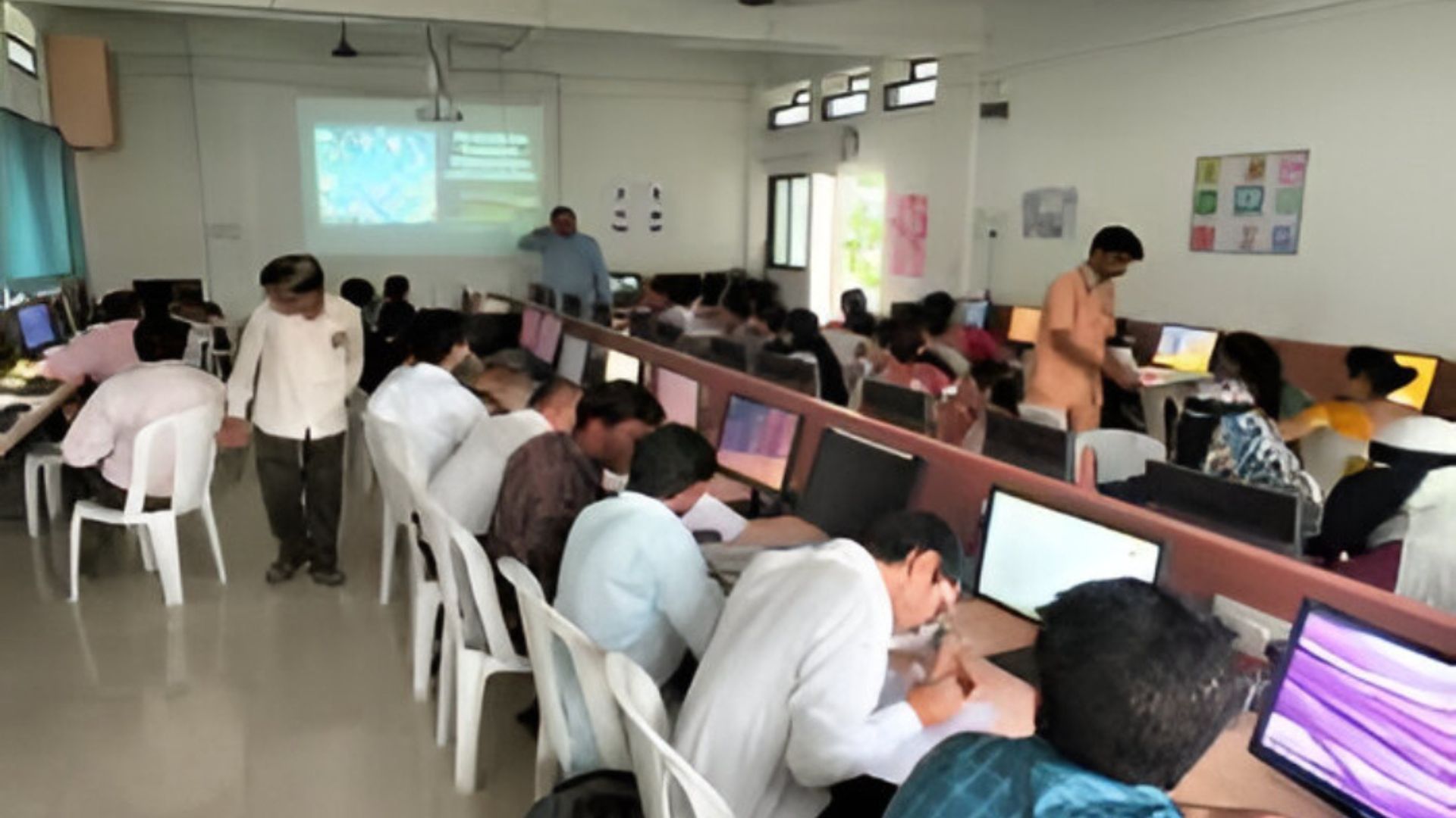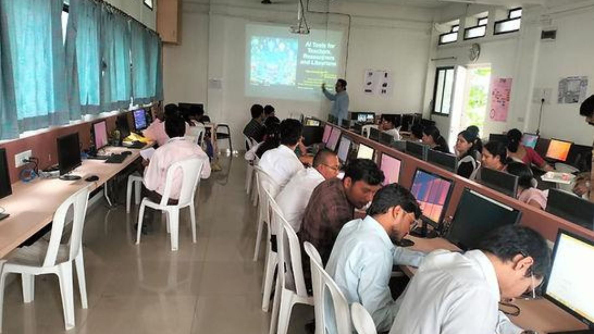 During the practical session, participants were given hands-on demonstrations of various Artificial Intelligence tools used in teaching, research, and library management, with separate computers arranged for practice.