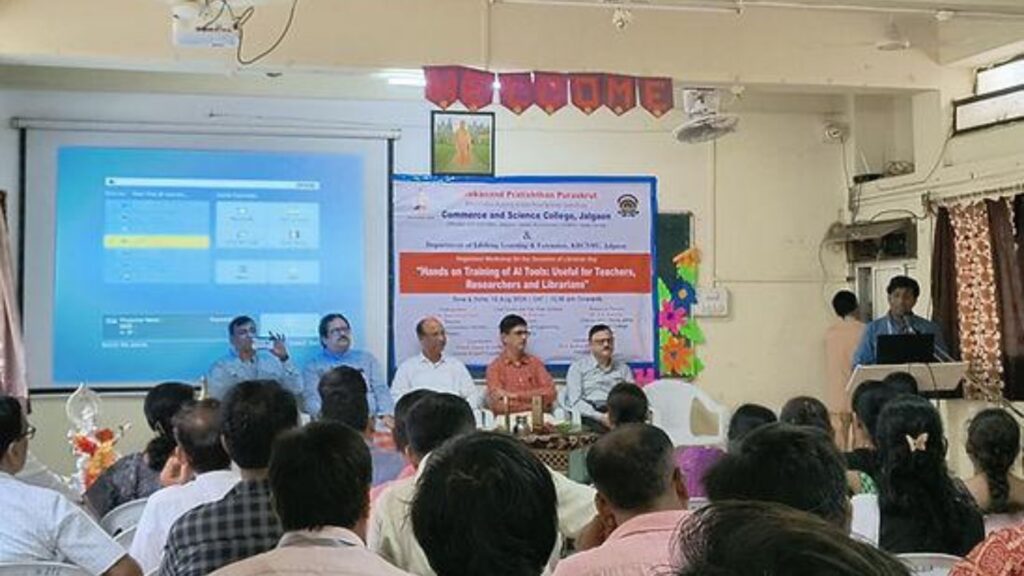 Considering the growing importance of Artificial Intelligence in academics, a state-level workshop on Artificial Intelligence was organized for professors, researchers, and librarians. The workshop was jointly conducted by Commerce and Science College of K.A.K.P. Institute, Vivekananda Foundation, and the Department of Lifelong Learning and Extension, KBC North Maharashtra University, on the occasion of Dr. S.R. Ranganathan’s birth anniversary and National Librarian’s Day.